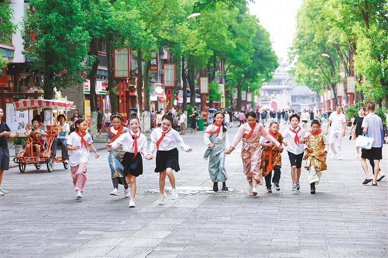 圖為藏渝兩地學生手牽手奔跑在山城街頭。通訊員 擁金卓嘎 攝