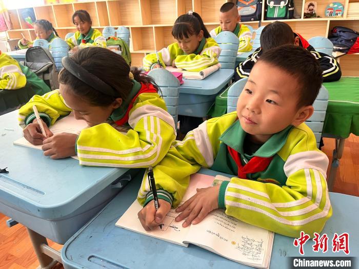 與此同時,四年級2班的漢族學(xué)生劉念恩正在上藏語文課,他抄寫有些慢,同桌的女生立刻用筆幫他找到對照位置?!拔覀儼嘀挥形乙粋€漢族,我也要上藏語文課,同學(xué)們和我關(guān)系非常好,我們經(jīng)常一起踢足球。”劉念恩說。