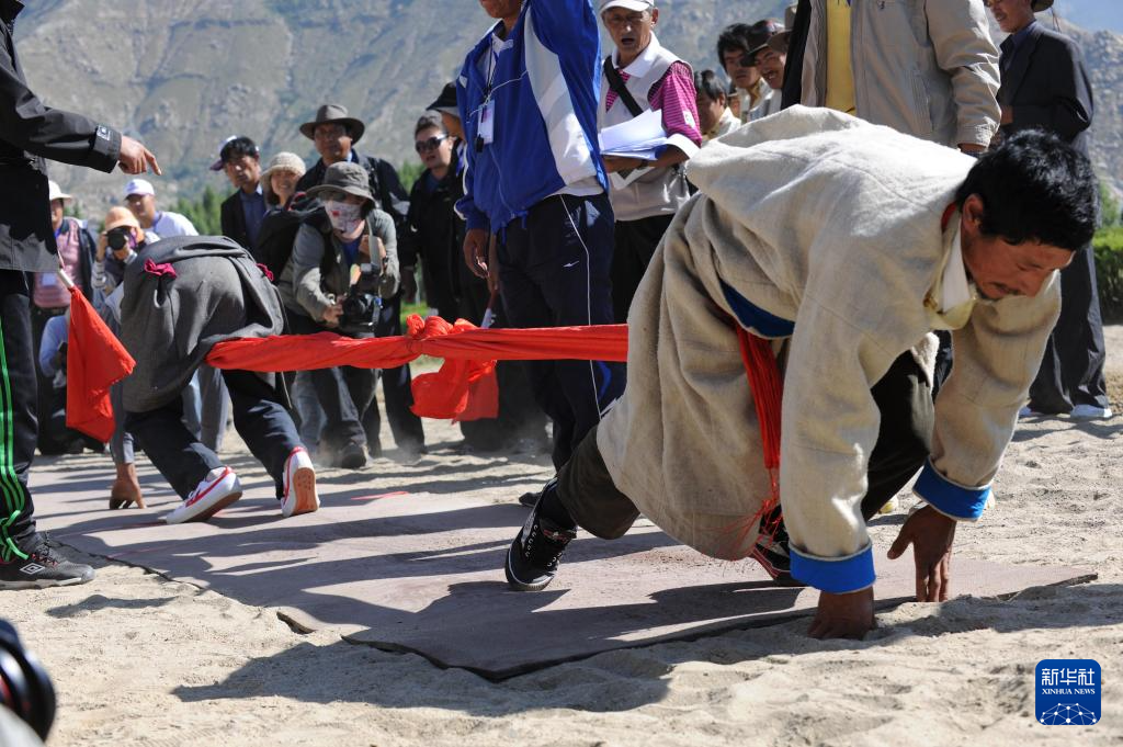 2011年8月30日,兩位來(lái)自拉薩農(nóng)牧區(qū)的群眾在雪頓節(jié)上進(jìn)行押加比賽。新華社記者 文濤 攝