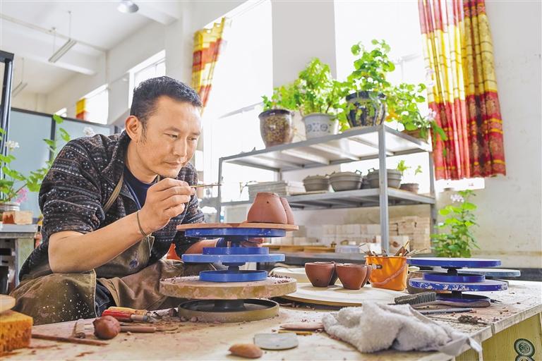 圖為察雅縣香堆鎮(zhèn)明亮民族手工藝品制造有限公司的手工藝人在制作陶瓷。 記者 丹增群培 攝