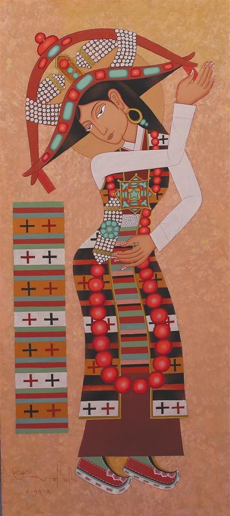 在昂?!皞鹘y(tǒng)當(dāng)隨時(shí)代”的藝術(shù)理念浸潤(rùn)下,徒弟們總能在傳統(tǒng)與當(dāng)代的碰撞中找到獨(dú)特的表達(dá)坐標(biāo):來(lái)自日喀則的藝術(shù)家多吉次旺,早年被昂桑畫(huà)作中藏文元素與抽象色塊的融合所震撼。如今在拉薩創(chuàng)辦工作室的他,正將藏文書(shū)法的中鋒筆觸解構(gòu)為流動(dòng)的視覺(jué)符號(hào)——烏金體的頓挫韻律幻化為色彩的潮涌,在畫(huà)布上重現(xiàn)古老史詩(shī)的“當(dāng)代心跳”;而主演《文成公主》實(shí)景劇的馮佳,這位四川傳媒大學(xué)表演系的畢業(yè)生,跟隨昂桑學(xué)畫(huà)四年,已能在《文成公主》系列中將唐卡礦物顏料的莊重與波普藝術(shù)的色塊切割并置,讓歷史人物既保有壁畫(huà)般的莊重感,又流淌著屬于時(shí)代的視覺(jué)節(jié)奏。