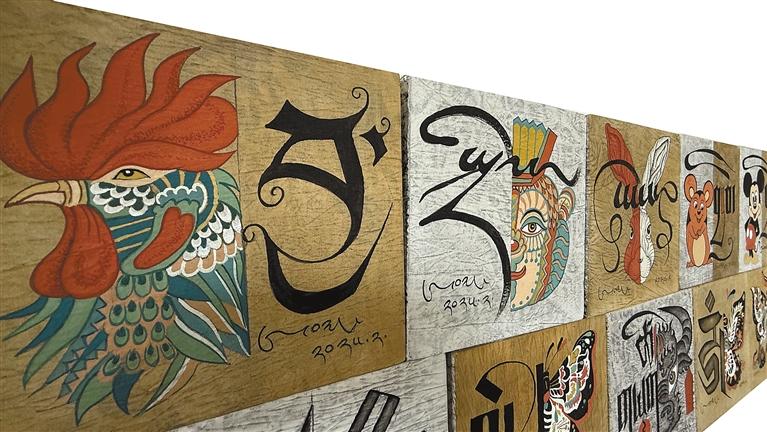 在昂桑的工作室中,《一日一畫(huà)》系列尤為醒目:藝術(shù)家采用布面重彩技法,讓唐卡礦物顏料與現(xiàn)代丙烯顏料滲透交融,傳統(tǒng)吉祥紋樣與幾何抽象圖案共生。韓書(shū)力評(píng)價(jià):“他讓千年顏料與當(dāng)代審美共振,完成傳統(tǒng)藝術(shù)的‘基因重組’。”