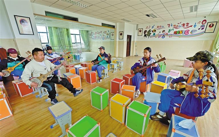 圖為拉薩市第四中學(xué)學(xué)生在扎念琴社團(tuán)課上與老師共同彈奏扎念琴。記者 唐斌 攝