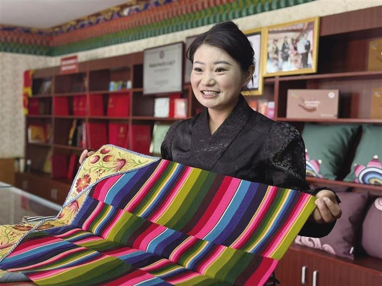 2018年,她帶著杰德秀邦典亮相貢嘎縣“七彩邦典”文化節(jié),參展的巨型邦典被錄入吉尼斯世界紀錄,訂單如雪花般飛來。如今,合作社產(chǎn)品遠銷日本、印度、尼泊爾等10余個國家,年營收突破200萬元。在合作社的38名固定員工中,有4名貧困戶、3名殘疾人。
