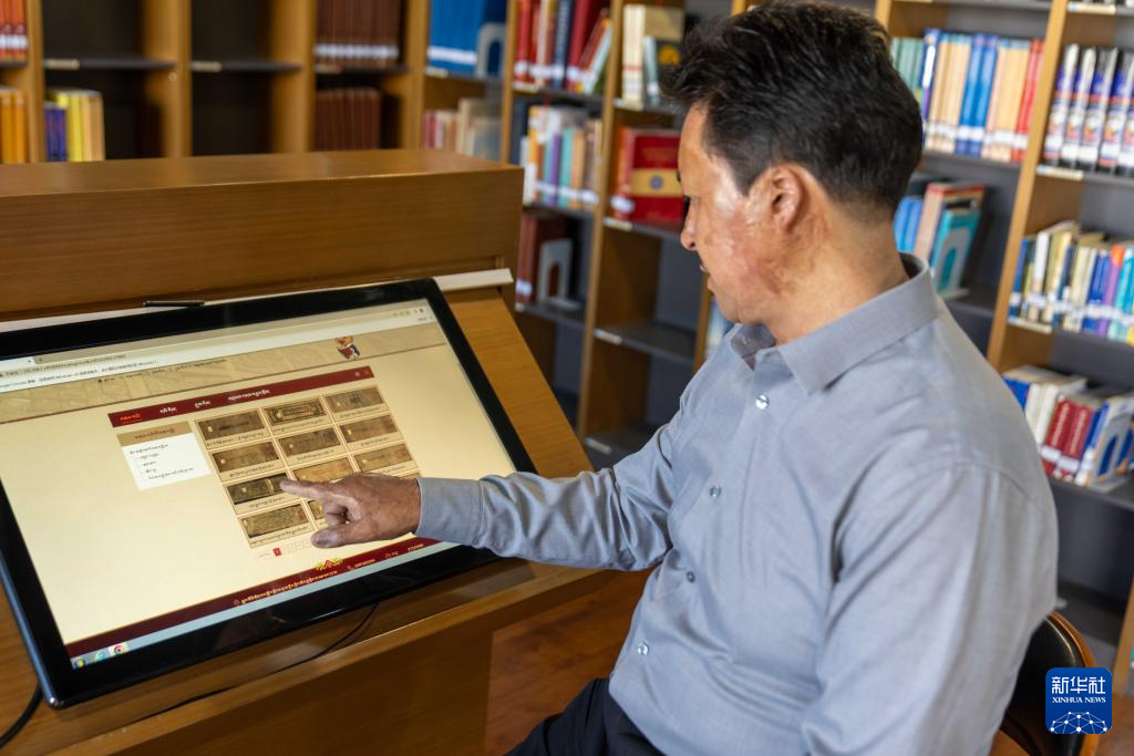 8月13日,西藏自治區(qū)圖書館副館長(zhǎng)邊巴次仁在介紹數(shù)據(jù)庫(kù)中的藏文古籍。新華社記者 旦增尼瑪曲珠 攝 ??