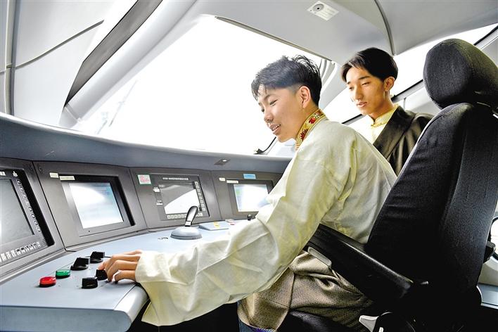 來自山西大學(xué)附屬中學(xué)西藏班的學(xué)生們在返鄉(xiāng)前,走進(jìn)太原動車所探秘高鐵。圖為學(xué)生在動車機(jī)械師的引導(dǎo)下,體驗高鐵技術(shù)。張晉彤 記者 丹增平措 攝