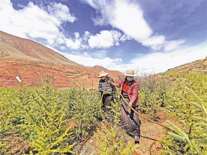 西藏昌都市丁青縣覺(jué)恩鄉(xiāng)絨通村苗木種植項(xiàng)目總投資2000萬(wàn)元,采取“公司+基地+農(nóng)戶(hù)”的運(yùn)作模式。2018年底,基地開(kāi)工建設(shè),93戶(hù)農(nóng)戶(hù)以每畝每年1000元的價(jià)格參與500畝的土地流轉(zhuǎn),項(xiàng)目實(shí)施階段共計(jì)880人次的貧困戶(hù)參與了務(wù)工。至2019年6月,已成功栽下云杉、昌都楊、柳樹(shù)、榆樹(shù)4個(gè)品種,共計(jì)97萬(wàn)株樹(shù)苗。目前,在基地長(zhǎng)期務(wù)工的村民有8名,年收入近2萬(wàn)元。