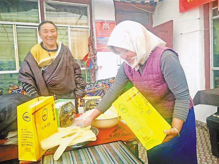 全區(qū)第一個家庭牧場、班戈縣尼瑪鄉(xiāng)吾前村家庭牧場主人巴拉(左),和家人在為顧客打包牧場生產(chǎn)的奶制品。