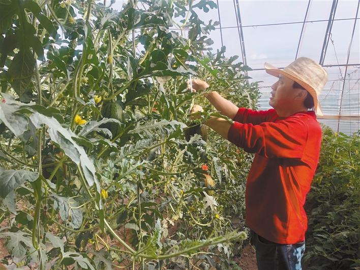 圖為在拉薩國家農(nóng)業(yè)科技示范園區(qū)里,菜農(nóng)李先生在給種植的西瓜套網(wǎng)袋。記者 李梅英 攝