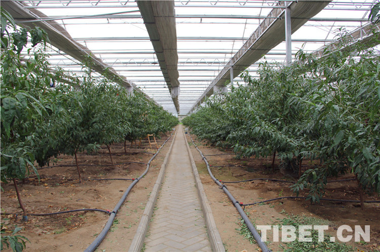 在高原上栽好一棵桃樹需要傾注更多的心血。經過大棚的中控室,王榮華說:“這里晝夜溫差大、紫外線強,冬天的時候還要澆凍水、拉膜蓋土、給樹打防凍液,在高原發(fā)展果樹種植困難不少。不同于內地的桃樹,在這里快4年了,露天的桃樹只長高兩三米。”說到這里,他不由感慨科技種植的力量:“大棚里的桃樹一年就長到3米多高,并且掛果了。回想2017年時,露天種下的桃樹只有手指粗細,如今長勢這么好,真有點不可思議?!?/p>