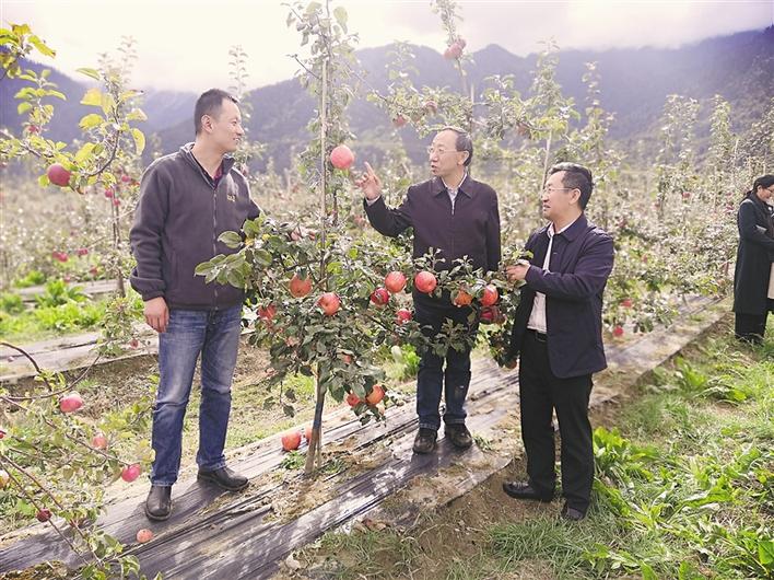 圖為國(guó)家蘋(píng)果產(chǎn)業(yè)技術(shù)體系首席科學(xué)家霍學(xué)喜(中)在米林縣羌納蘋(píng)果示范基地現(xiàn)場(chǎng)開(kāi)展技術(shù)指導(dǎo)。記者 李梅英 攝