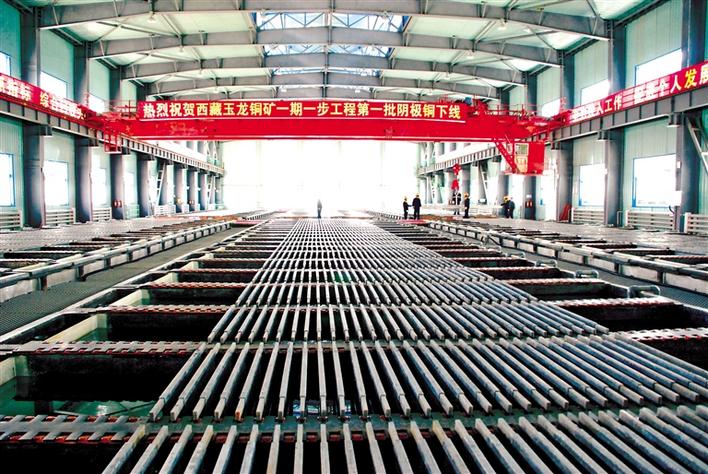 圖為玉龍銅礦(地處昌都市江達縣)一期工程第一批陰極銅下線。 記者 陳志強 攝