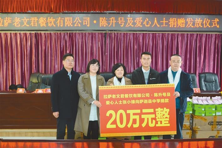 10月 28日,拉薩老文君餐飲有限公司·陳升號及相關(guān)愛心人士向薩迦縣中學(xué)捐贈405雙價值68445元的運動鞋,并達成20萬元捐款意向,用于薩迦中學(xué)教育發(fā)展。