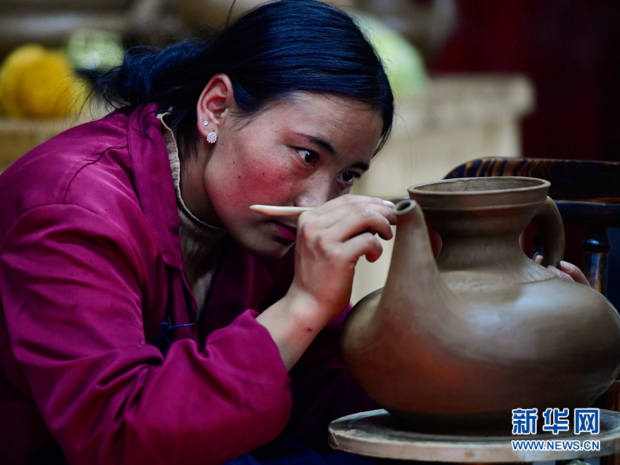 出身黑陶世家的謝格太就是當地有名的黑陶技師。2014年,謝格太成立班瑪黑陶旅游產品開發(fā)有限責任公司,規(guī)?;a和銷售黑陶,并帶領學徒一起鉆研黑陶技藝,傳承和創(chuàng)新黑陶手工技藝文化。和泥、捏制、打磨、發(fā)酵、火燒、熏黑、拋光,經過十幾道工序的磨煉,學徒們在謝格太的帶領下,不僅學到了技藝,傳承了技術,每月還能拿到數千元的生活補助。