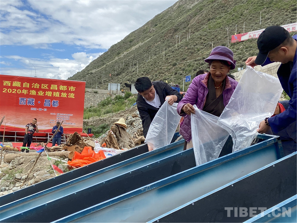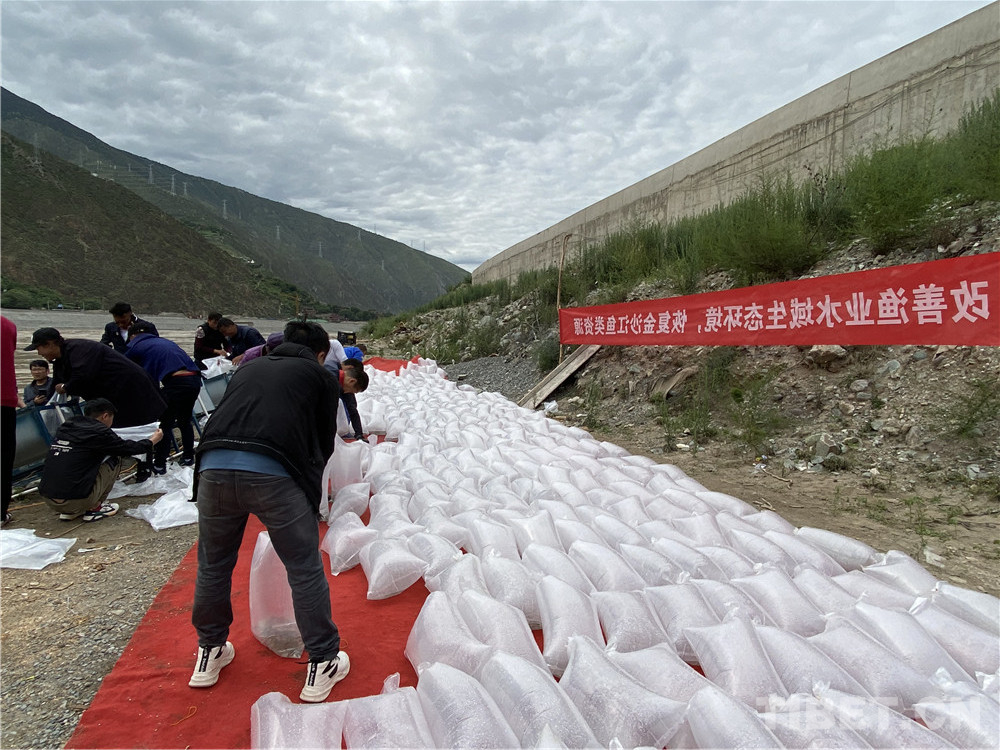 在工作人員協(xié)助下,老阿媽把一袋袋魚苗放入江中。據(jù)老阿媽說,當(dāng)年十八軍進(jìn)藏路過這里,帶的糧食不多,他們不向當(dāng)?shù)厝苏骷Z,有些人餓得浮腫。江河中的魚兒好抓,但沒有一個戰(zhàn)士違反紀(jì)律去抓魚。藏族敬畏魚,不捕魚,不吃魚。解放軍尊重當(dāng)?shù)仫L(fēng)俗,即使餓死也不抓魚充饑。