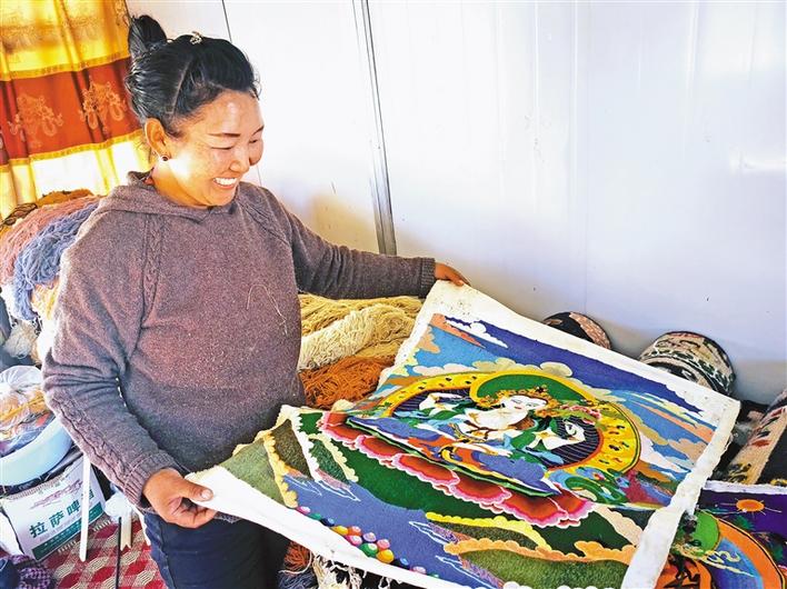 西藏日喀則市易地扶貧搬遷點(diǎn)群眾展示自己的藏繡作品。[詳細(xì)] -
