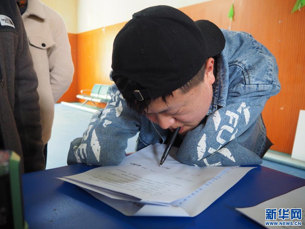 11日下午,位于西藏拉薩市的賽馬場正在舉行一場殘疾人創(chuàng)業(yè)滾動資金發(fā)放儀式。岳曉天熟練地用嘴含著筆,在資金發(fā)放協(xié)議書上簽上了自己的名字,字跡美觀工整,絲毫看不出是用嘴含著筆寫的。