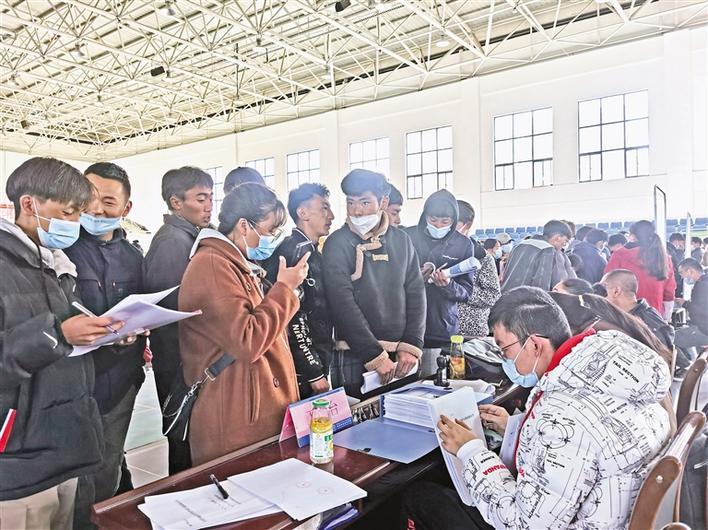 圖為西藏職業(yè)技術(shù)學(xué)院2021屆農(nóng)牧類專業(yè)畢業(yè)生校園招聘會現(xiàn)場,新希望六和股份有限公司工作人員向?qū)W生介紹招聘信息。記者 王莉 攝
