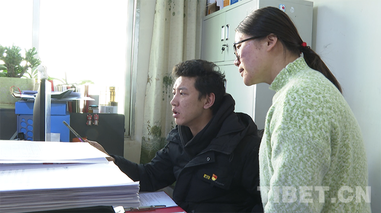 圖為江達(dá)縣委組織部副部長劉成明與同事討論工作