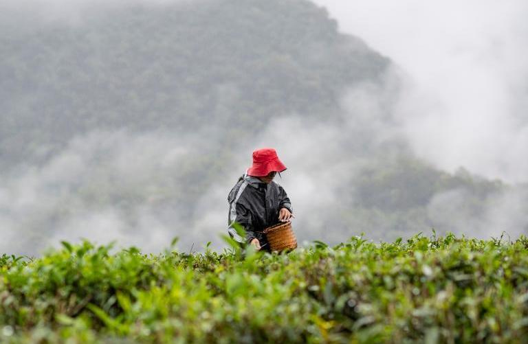 門(mén)巴族姑娘貢桑拉姆正在云霧繚繞的茶園里采摘茶青.[詳細(xì)] -