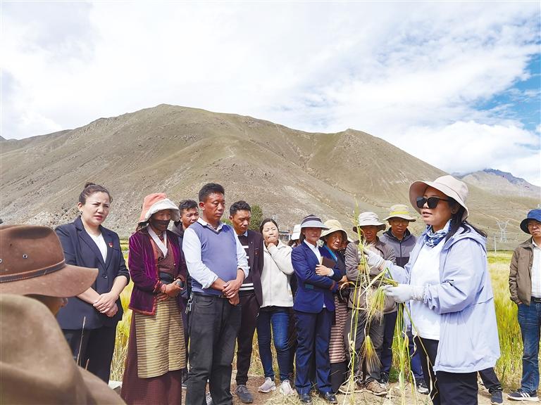 圖為日喀則市農(nóng)牧業(yè)科學(xué)研究推廣中心農(nóng)藝師德吉央宗(右二)深入田間地頭現(xiàn)場講解雜株雜草防治技術(shù)及辨別方法。 記者 扎西頓珠 攝