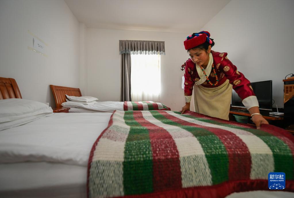 麻麻門巴新村的白瑪卓瑪在自己的家庭旅館中整理床鋪。新華社發(fā)(劉東君 攝)