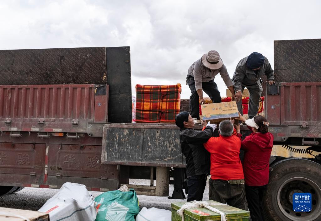 雙湖縣多瑪鄉(xiāng)果根擦曲村的村民將行李搬上貨車(7月12日攝)。新華社記者 周荻瀟 攝