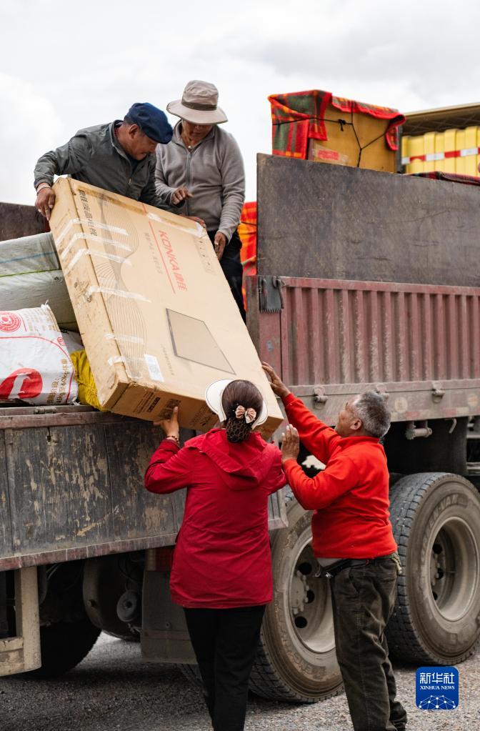 雙湖縣多瑪鄉(xiāng)果根擦曲村的村民將家具裝車,準備搬遷(7月12日攝)。新華社記者 周荻瀟 攝