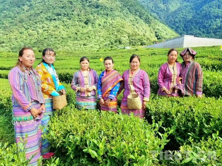 圖為羅布央宗(左二)和村民一起采茶