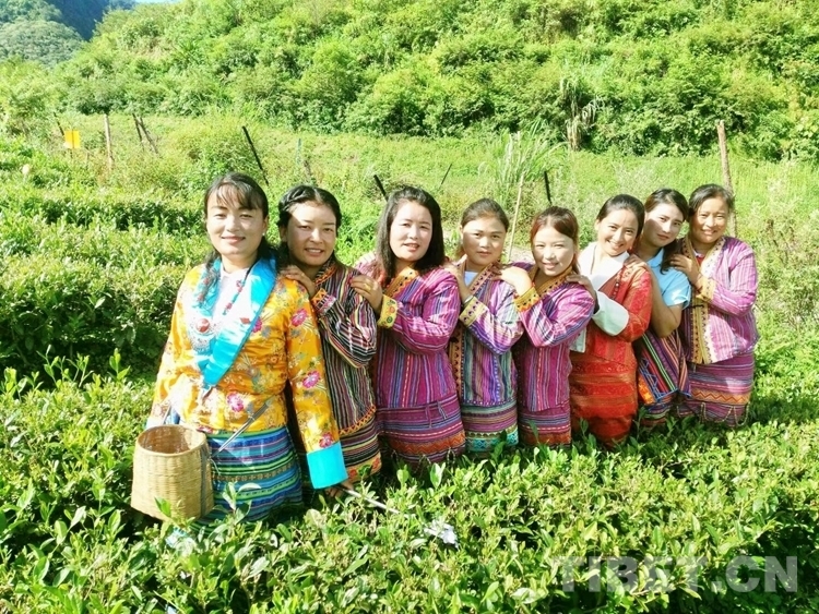 圖為羅布央宗(左一)和村民在茶園工作間隙合影