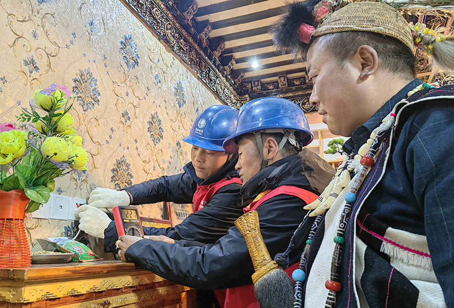 藏歷新年前,供電所服務(wù)班長索朗吾珠、班員云丹正在檢查家庭旅館的電源開關(guān)(2月19日攝)。國網(wǎng)西藏電力供圖 陶丹丹 攝