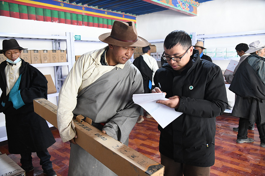日喀則市昂仁縣多白鄉(xiāng)多白村村民在國家電網(wǎng)在藏首個(gè)“電力愛心超市”用積分兌換物品(3月30日攝)。國網(wǎng)西藏電力供圖 索娜央金 攝