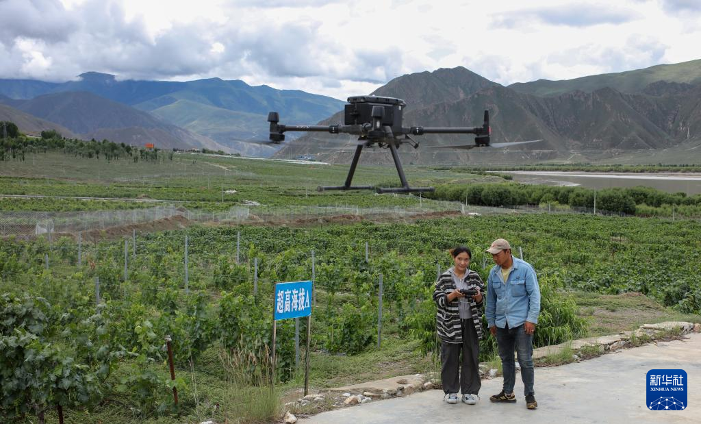 7月26日,桑日縣一家葡萄酒企業(yè)的員工曲珍(左)在葡萄園里向技術(shù)員何志榮學習使用農(nóng)用無人機。新華社記者 姜帆 攝