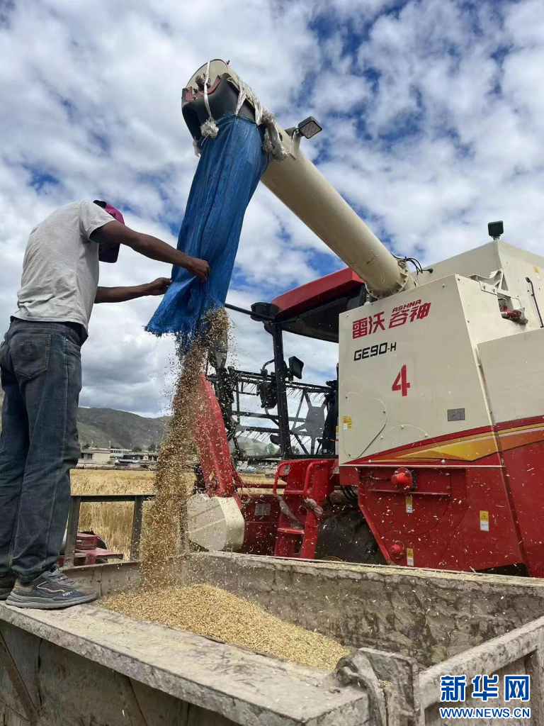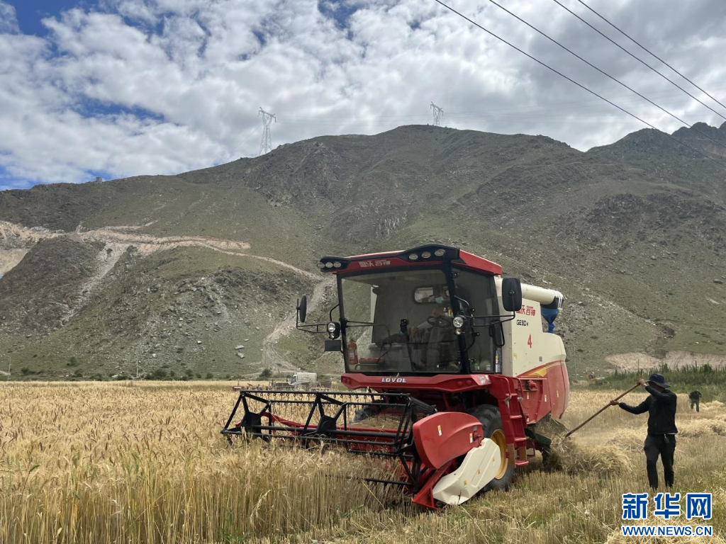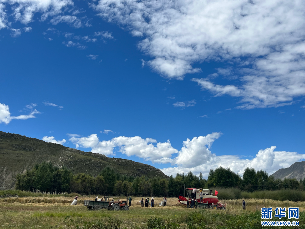 秋收時節(jié),西藏各地加快推進秋收工作。在西藏拉薩市達(dá)孜區(qū),金色的田野里聯(lián)合收割機、拖拉機和電動三輪車來回穿梭,收割、摘穗、秸稈粉碎、運輸……一片繁忙景象。