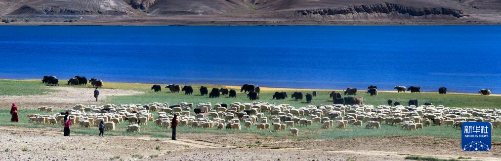 牧民在阿里地區(qū)日土縣班公湖畔放牧白絨山羊和牦牛(無人機照片,9月21日攝)。新華社記者 姜帆 攝