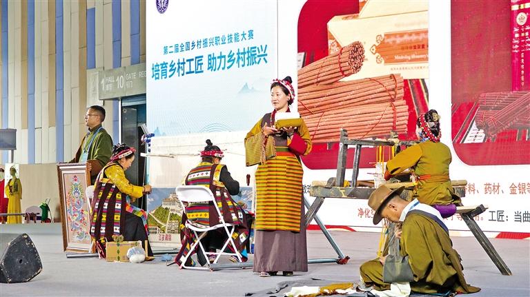 在鄉(xiāng)村工匠技能技藝展示交流中,西藏工匠代表在展示自己的作品。 記者 次仁片多 瑯珍 攝
