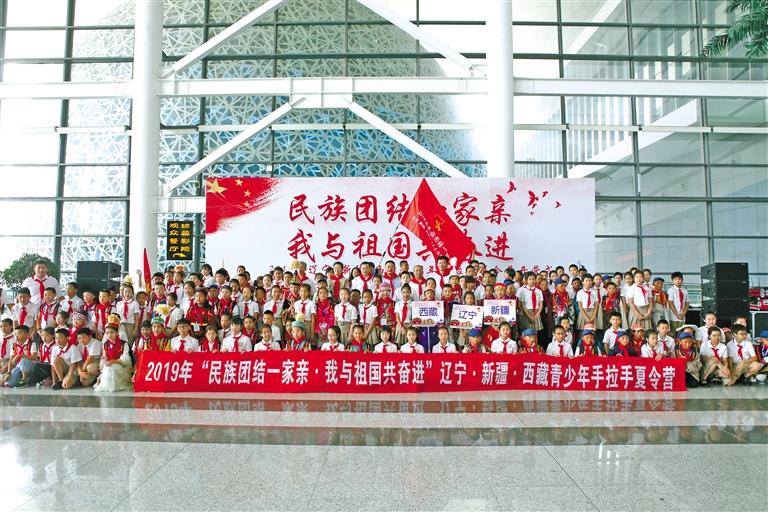 2019年“民族團(tuán)結(jié)一家親·我與祖國(guó)共奮進(jìn)”遼寧·新疆·西藏青少年手拉手夏令營(yíng)開營(yíng)儀式現(xiàn)場(chǎng)。