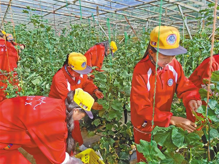 鞍山市援建的巴青縣中學(xué)勤工儉學(xué)實(shí)踐基地內(nèi),學(xué)生在采摘。