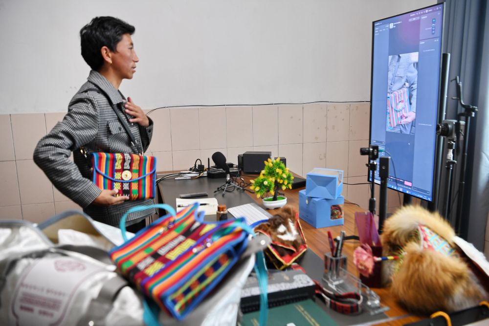 倉(cāng)秋多吉通過網(wǎng)絡(luò)銷售當(dāng)?shù)氐漠a(chǎn)品(8月24日攝)。