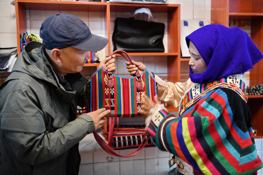一名來自上海的游客(左)在安多托尕爾倉(cāng)游牧產(chǎn)業(yè)有限責(zé)任公司展廳挑選產(chǎn)品(8月24日攝)。