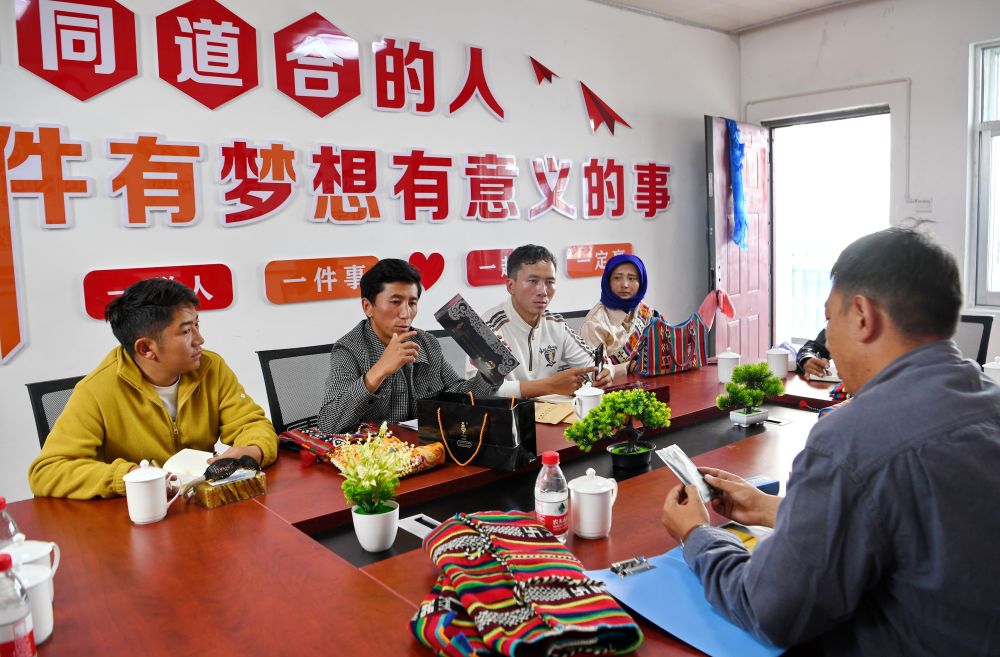倉(cāng)秋多吉(左二)和團(tuán)隊(duì)核心成員商討產(chǎn)品銷售提升策略(8月24日攝)。