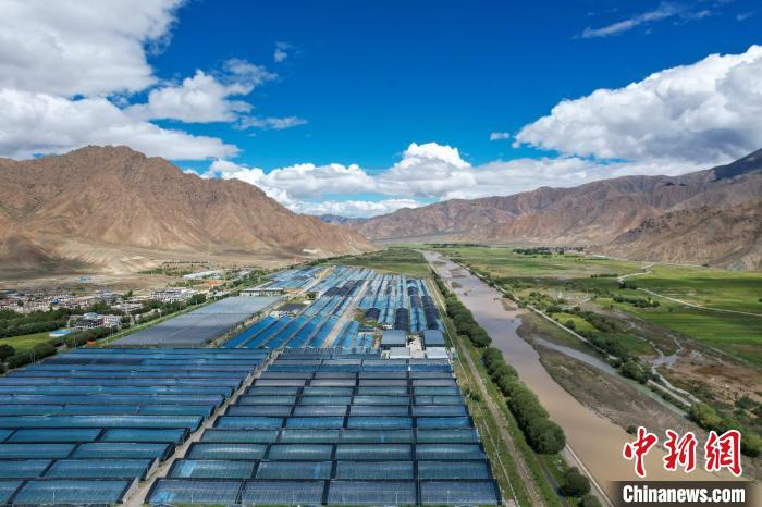 經(jīng)過近三十年的發(fā)展,西藏白朗縣大棚蔬菜產(chǎn)業(yè)已具規(guī)模。圖為航拍白朗縣年楚河畔的大棚設(shè)施。記者 江飛波 攝