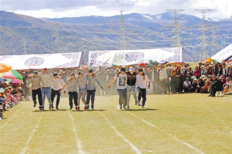 圖為農牧民參加三人兩足比賽。 本報記者 旦增嘎瓦 攝