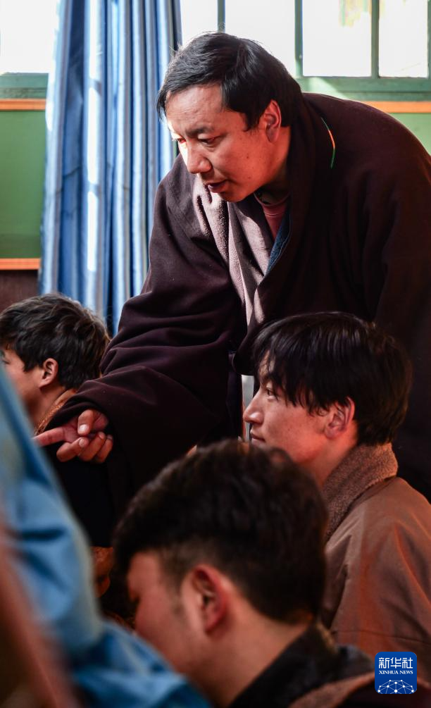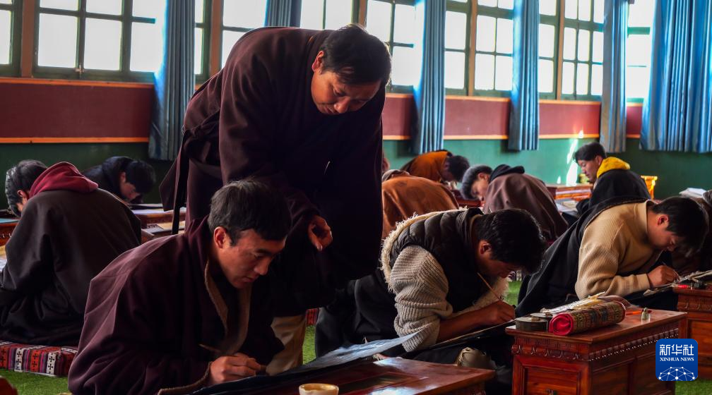 11月22日,昌都市丁青縣擁忠文化藝術中心非遺扶貧就業(yè)工坊老師在指導學員寫藏文書法。新華社記者 格桑朗杰 攝