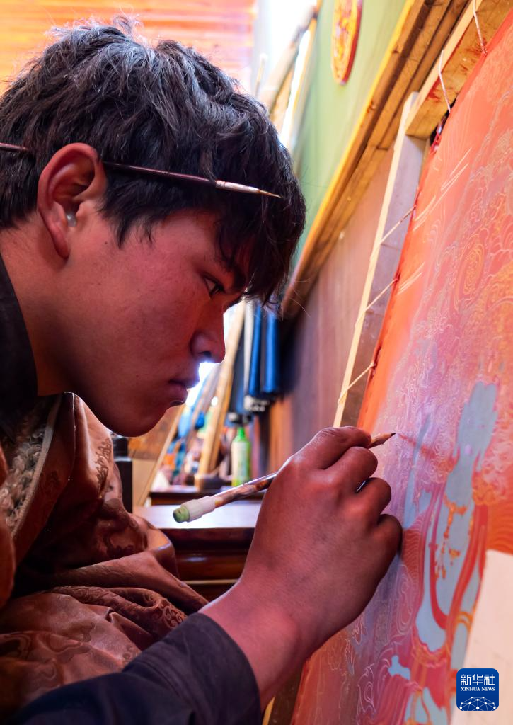 11月22日,昌都市丁青縣擁忠文化藝術中心非遺扶貧就業(yè)工坊學員在畫唐卡。新華社記者 格桑朗杰 攝