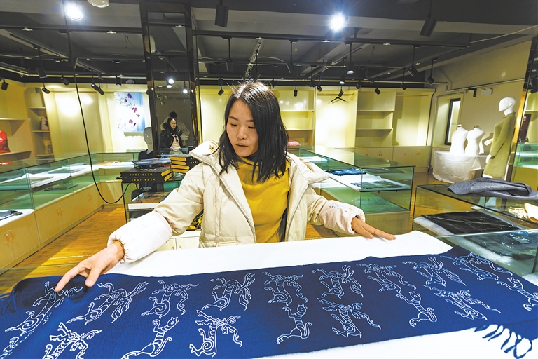 圖為日土縣白山羊絨產(chǎn)業(yè)展示中心的工作人員展示印有日土巖畫(huà)圖案的“指環(huán)披肩”。新華社記者 姜帆 攝
