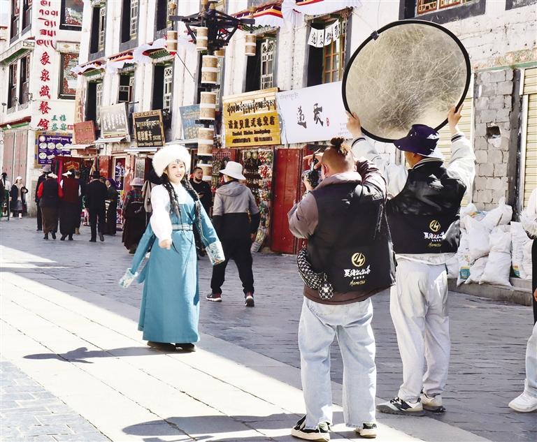 在八廓街體驗(yàn)藏裝藝術(shù)照的游客。資料圖