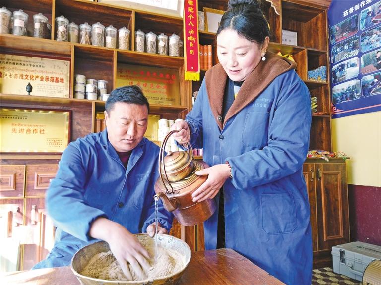 洛桑與曲旺調(diào)配藏香原料 圖/文 記者 鹿麗娟 通訊員 益西曲珍 次昂