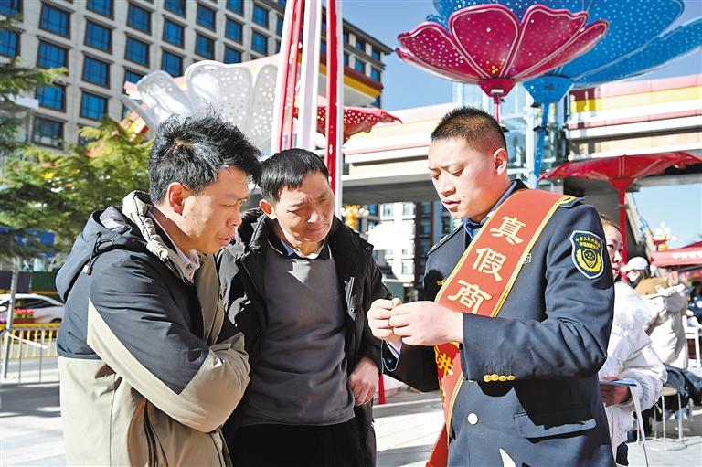 圖為桑珠孜區(qū)市場(chǎng)監(jiān)管局投訴舉報(bào)中心負(fù)責(zé)人李良友(右)向市民講解商品真假辨別方法。記者 扎西頓珠 攝