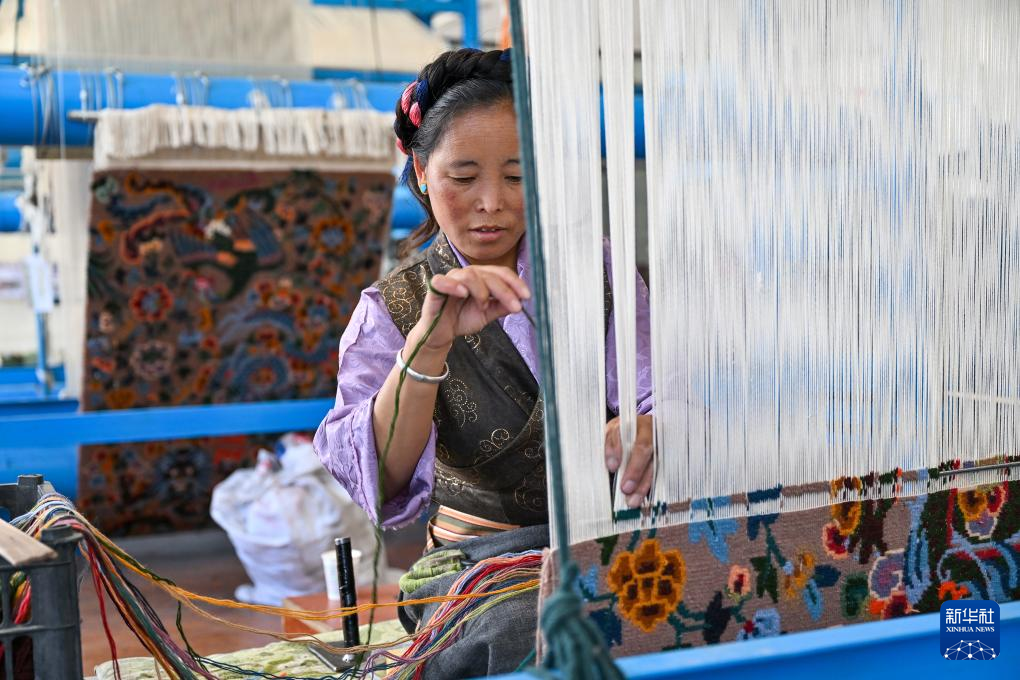 7月18日,江孜藏毯文化發(fā)展有限責任公司的員工在生產(chǎn)車間內(nèi)編織藏毯。新華社記者 李鑫 攝